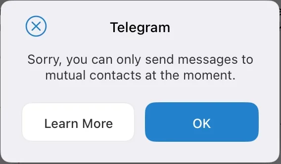 一些读者反应,使用中国大陆+86手机号注册的telegram账号,会出现无法给非联系人发送消息的情况。聊天窗口提示“Sorry, you can only send messages to mutual contacts at the moment”。这是对中国大陆手机号的一种特殊限制。接下来本来讲解如何解除这个telegram电报无法发消息的限制。